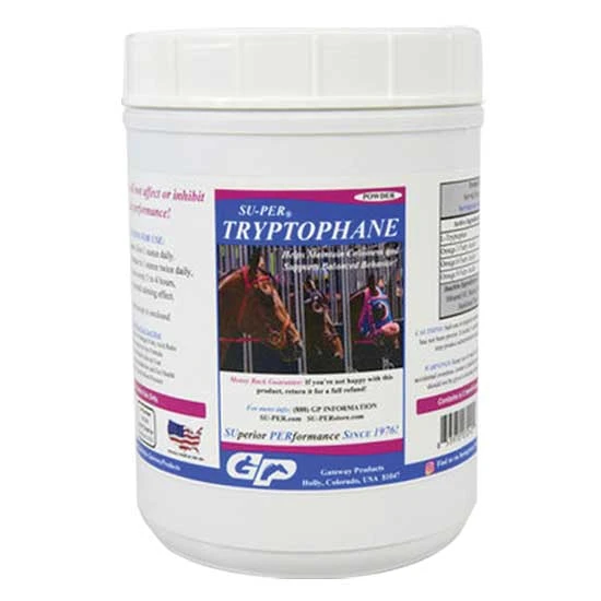Super Tryptophan by Gateway Products is an L-Tryptophan (amino acid) feed supplement for use in the daily feed ration of horses. Keeps horses calm and focused without reducing alertness.